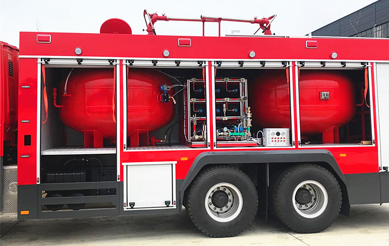 2.上裝:整車拉大了整體長度,正中心區域安置了兩個碩大的干粉罐與兩套各自的干粉系統,頂部兩把大型的干粉槍,整體來講的話這兩套系統互不干擾也互不影響,也可以同時進行干粉滅火操作,干粉槍的射程在30米,標配都為國產配件選材都是國內一線材質與口碑的供應,也可以根據客戶需求來選裝進口件。